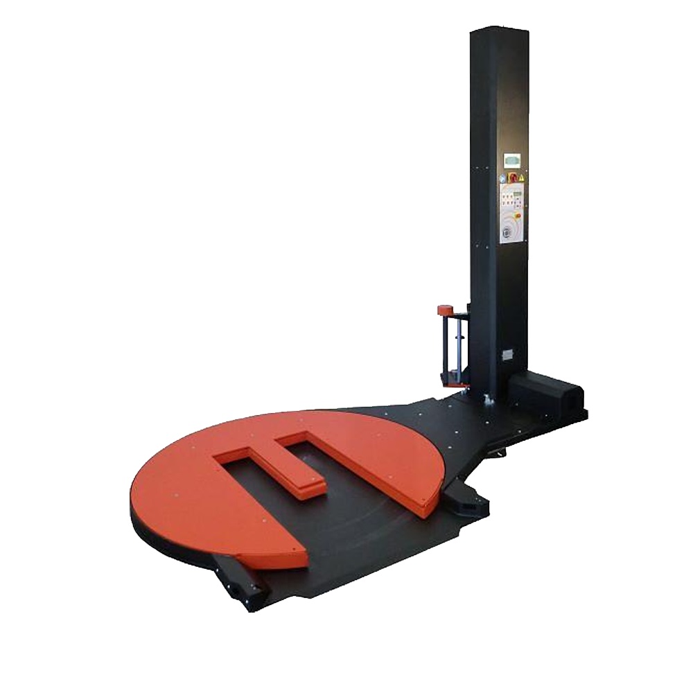 Les banderoleuses semi-automatiques à plate-forme rotative permettent de banderoler latéralement la charge palettisée. L’enroulement s’effectue par l’action combinée de la rotation de la charge placée sur la plate-forme et du glissement vertical du chariot porte-bobines le long de la colonne de support. Dans ce type de banderoleuse semi-automatique, les opérations de chargement-déchargement des palettes sur la plate-forme sont effectuées par un opérateur à l’aide d’un transpalette, qui accède directement à la plate-forme de rotation grâce à la forme particulière de l’ouverture présente sur cette dernière.